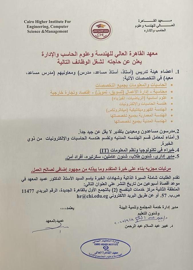 تحت رئاسة الاساتذة الدكتورة/ منى حسن سليمان - عميد المعهد - تشرف معهد القاهرة العالى للهندسة وعلوم الحاسب والادارة بتنظيم ندوه: