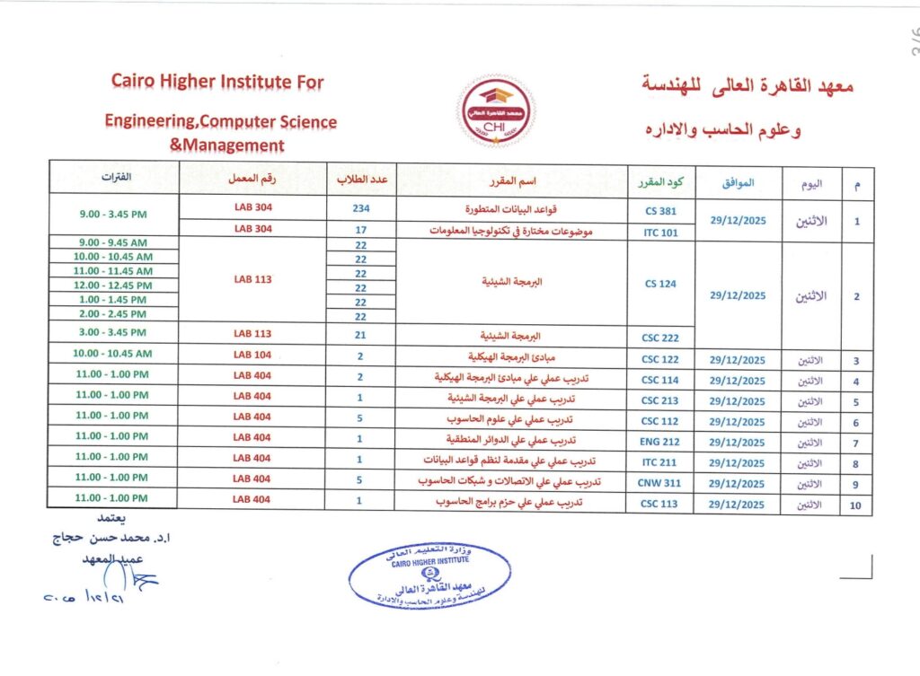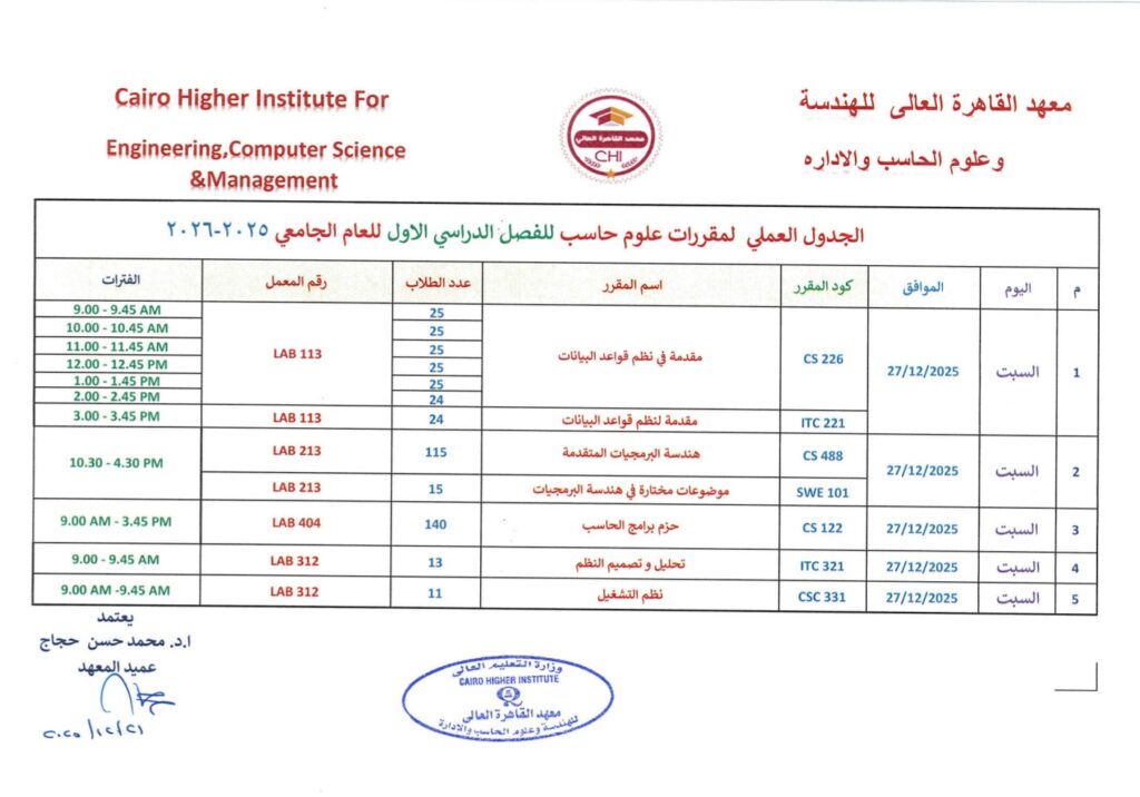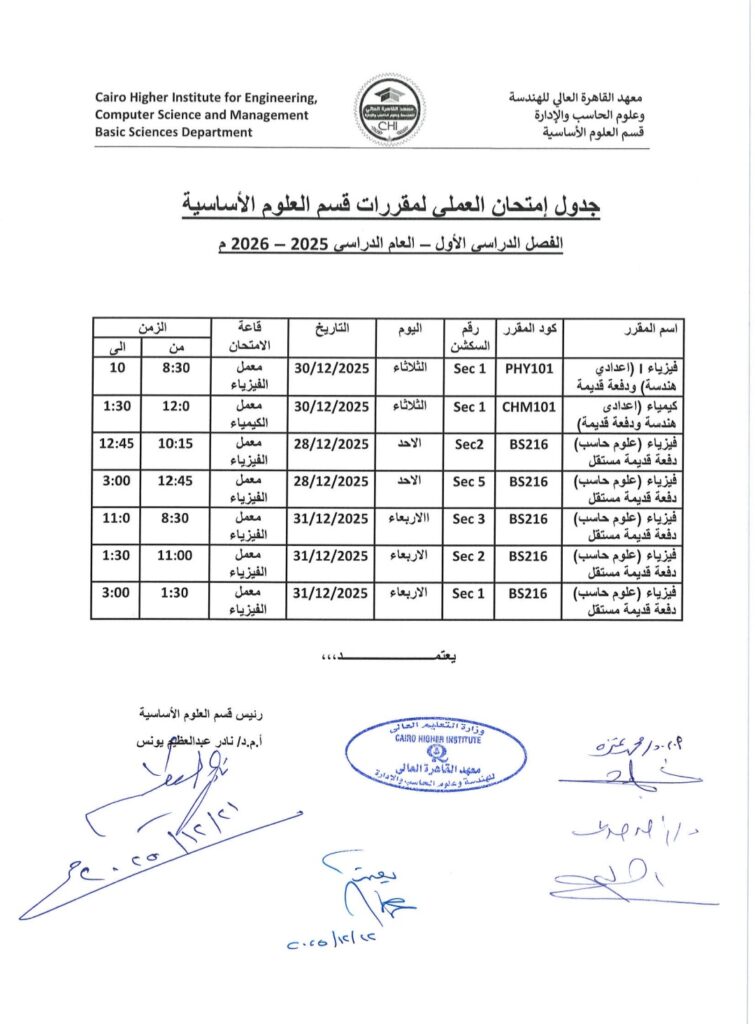 جدول امتحان العملي لقسم علوم الحاسب