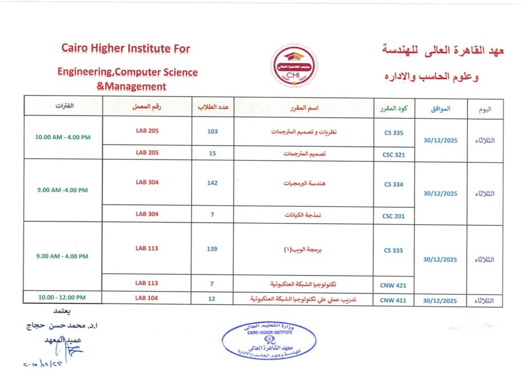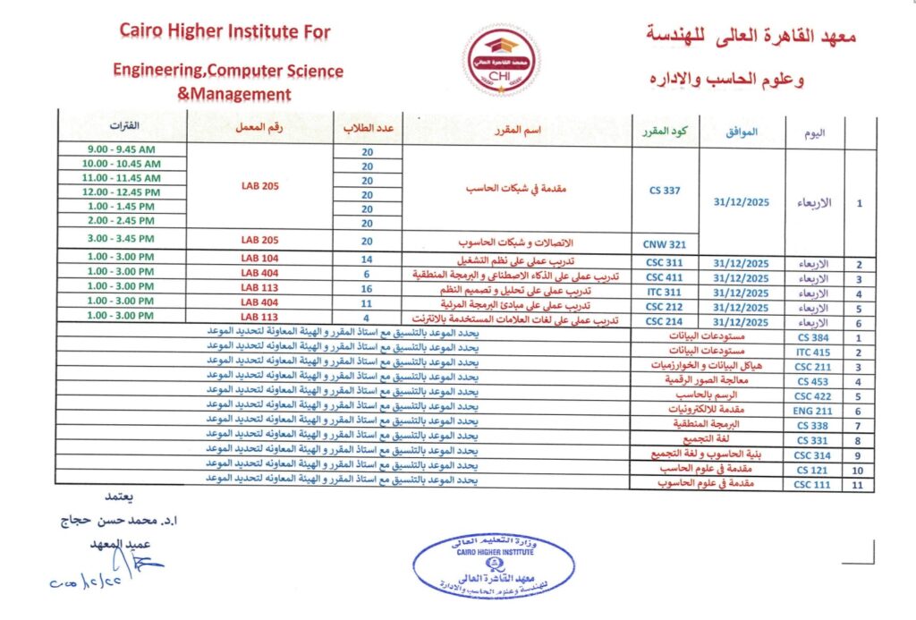جدول امتحانات النهائية العملي لقسم علوم الحاسب